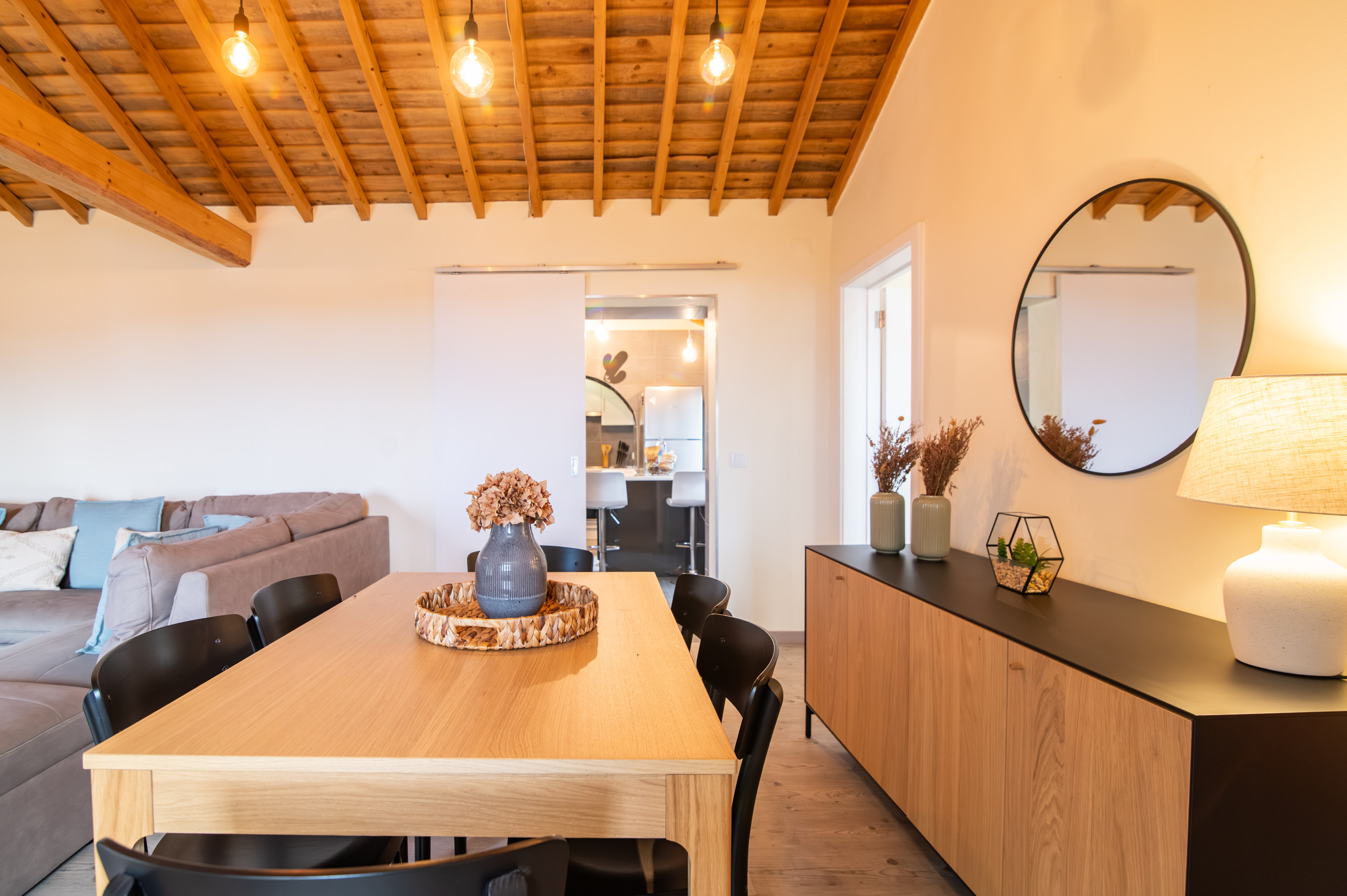 A cozinha está totalmente equipada, permitindo preparar as suas refeições com facilidade. A sala de estar e a sala de jantar oferecem um ambiente espaçoso e convidativo para momentos de convívio e relaxamento.