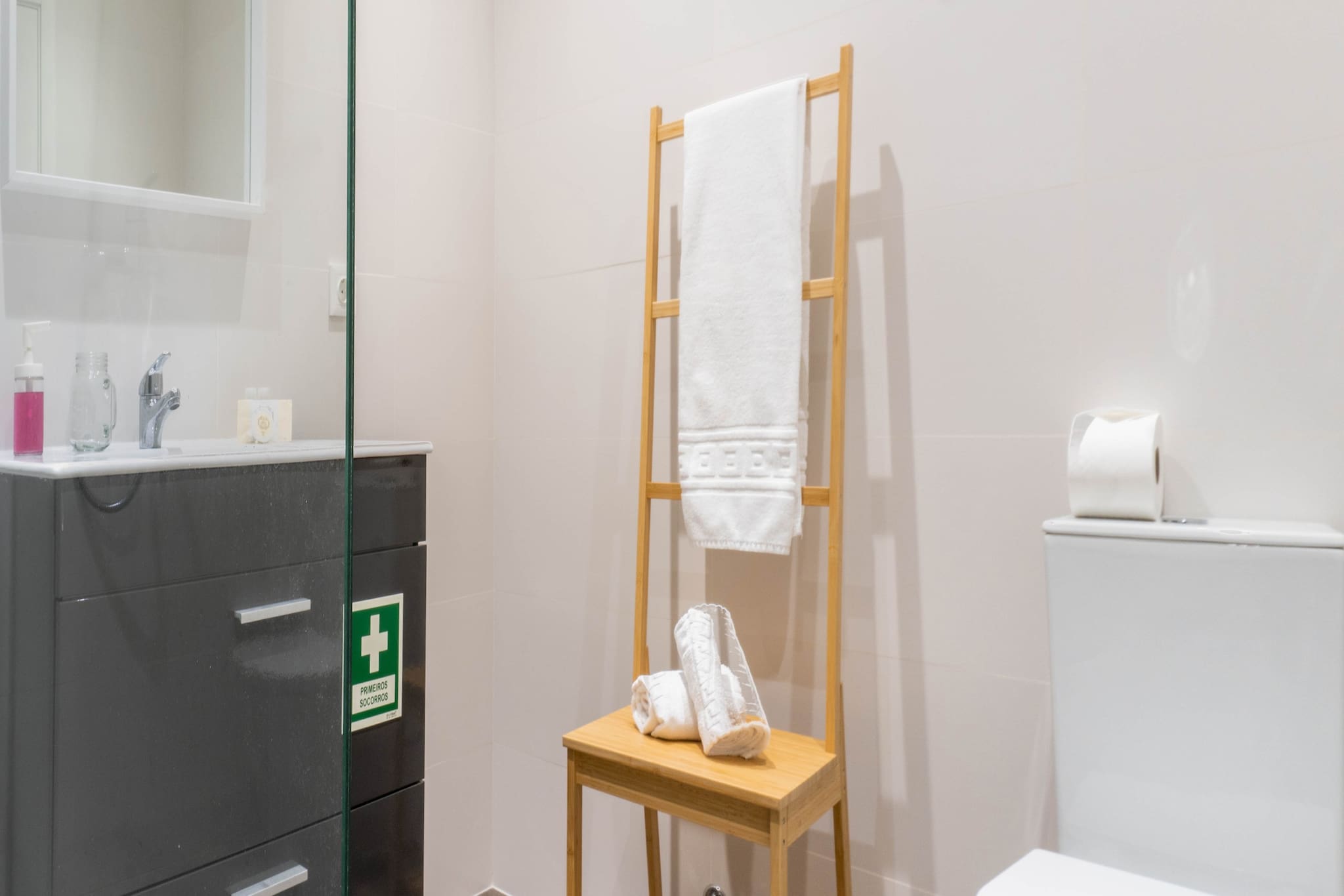 Dispomos de toalhas de banho de cor clara para uso na propriedade e de cor escura para uso no exterior, bem como secador de cabelo e kit de primeiros socorros.