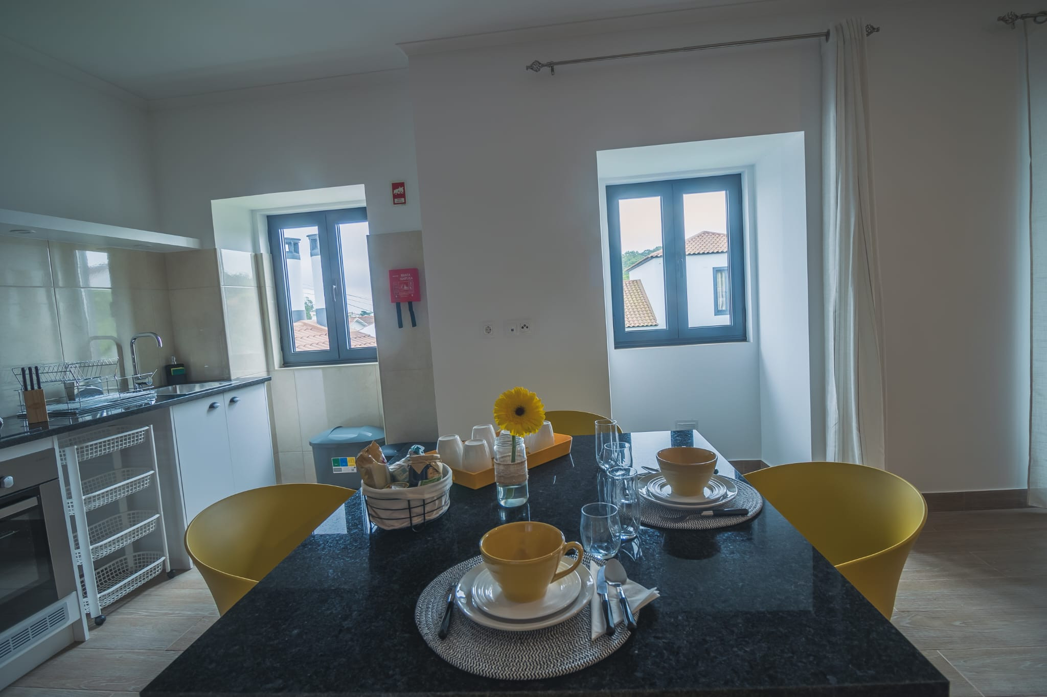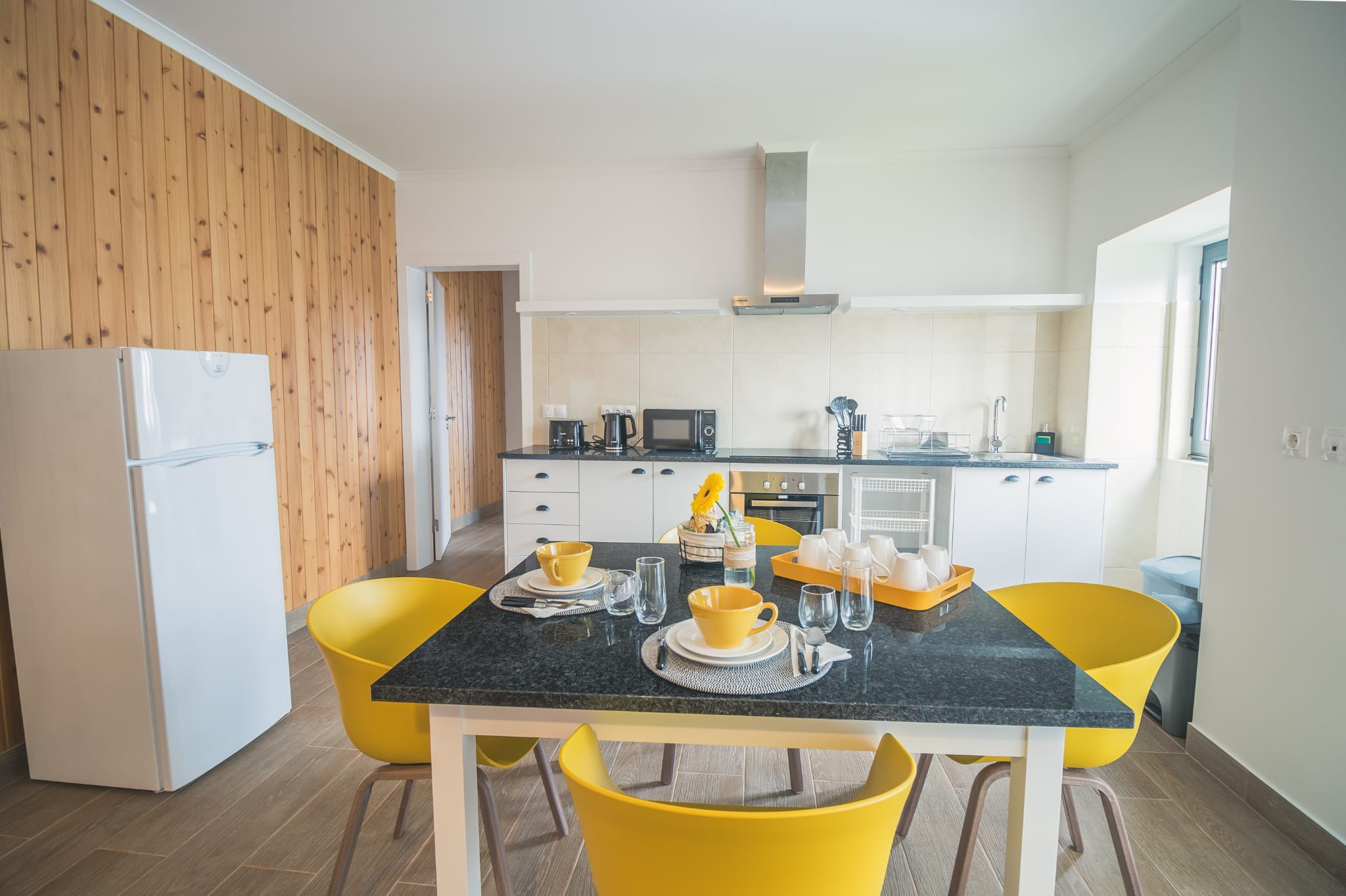 A cozinha, está equipada com frigorífico, microondas, forno, congelador, louça/talheres, utensílios/cozinha, torradeira e jarro eléctrico.